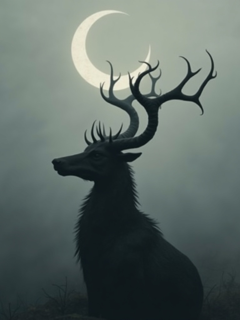 A dark fantasy portrait of a horned animal or mythical creature emerging from a muted gray background beneath a slim crescent moon, sculptural silhouette, quiet mythic mood