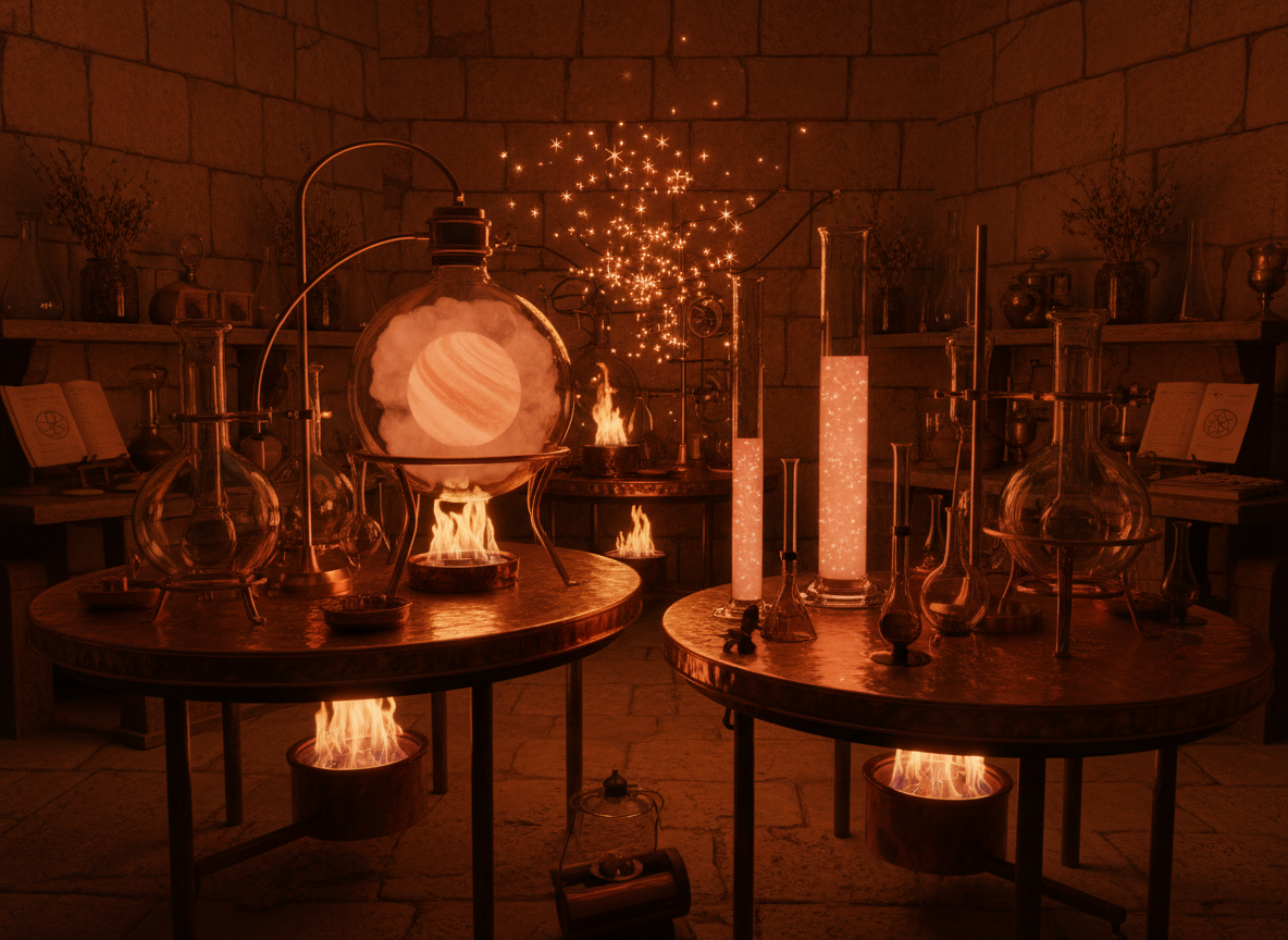 An alchemical laboratory at dusk where glass apparatus contains impossible orange reactions, one vessel holding light apricot vapor rotating like a planet, another filled with soft peach-orange liquid stars, natural orange flame reflections running across copper tables, saturated mandarin sparks suspended between the instruments, deep burnt orange corners of the room disappearing into shadow, ritual science atmosphere, hyper-detailed