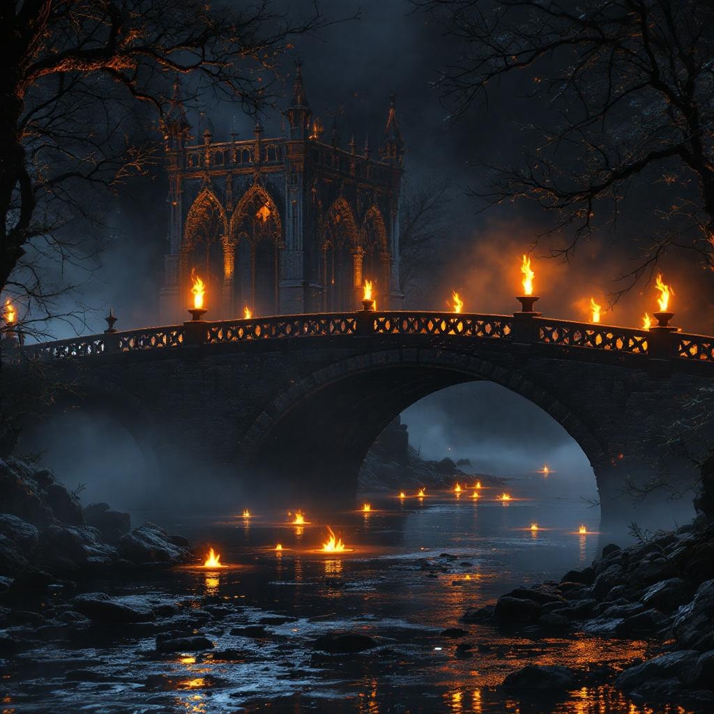 A skeletal Gothic bridge over a black river, its flying buttresses made of braided orange candle wax, with apricot flames floating beneath the arches instead of torches, mist rising from the water, richly textured stone, cinematic night scene, 8k