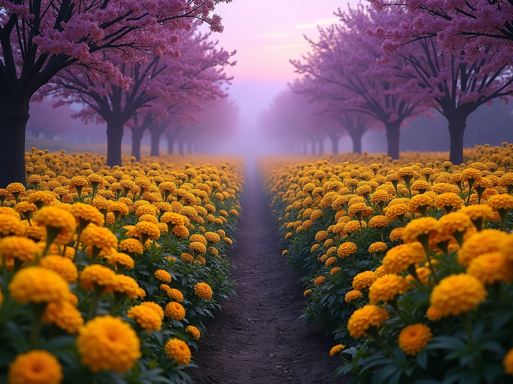A lush garden overflowing with dense marigold flowers in pale yellow, soft yellow, and canary-yellow tones, the flowers filling almost the entire frame, with violet mist weaving between the paths, deep plum trees in the background, lilac twilight sky above, immersive natural environment, vivid yellow and purple contrast, realistic, richly textured, sharp focus
