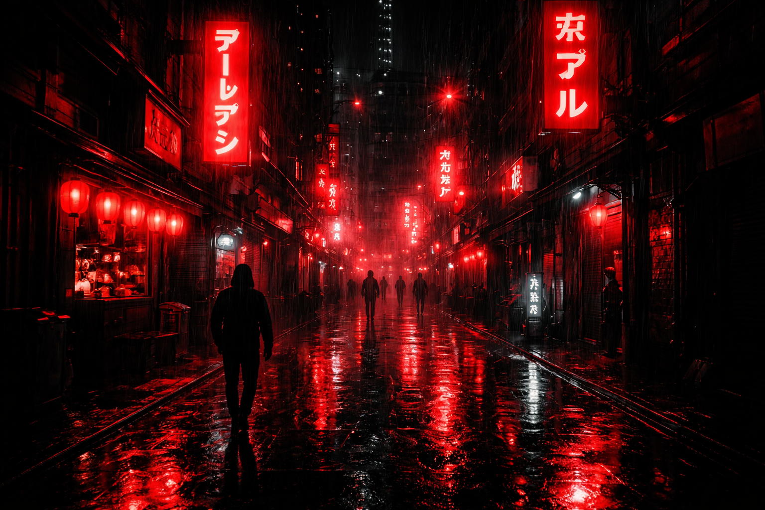Dark cyberpunk city at night, black background, strong red neon lights, rain, reflections on wet streets, high contrast, cinematic cyberpunk style