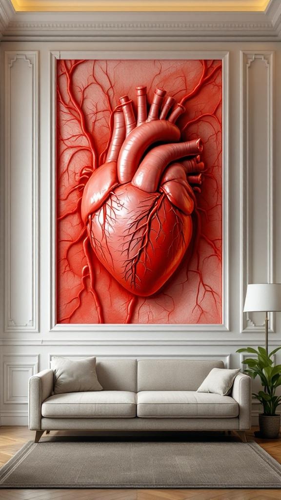 An elegant living room where the wallpaper has been replaced by the interior surface of a giant beating heart, crimson arterial walls pulsing gently, veins running along the ceiling like crown molding, a normal beige sofa and a reading lamp sitting on an ordinary rug as if nothing is wrong, unsettling domesticity, hyper-realistic anatomical texture, 8k