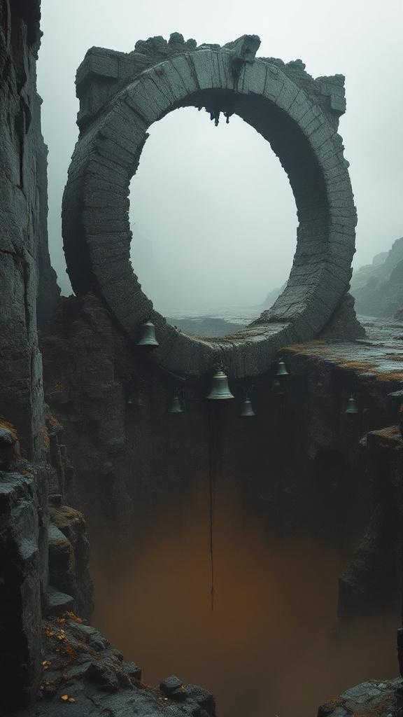 A ring of giant ruined bronze bells hanging over a stone abyss, brown fog below, gothic silence, Dante-inspired monumental composition