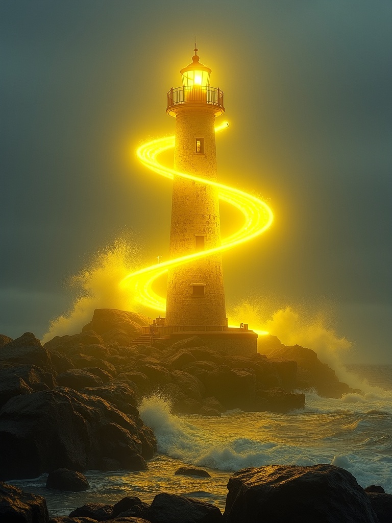 A yellow glass lighthouse whose beacon has become a physical spiral of canary-yellow light wrapping around the tower and spilling across the rocks below, wind, sea spray, detailed environment, sharp focus