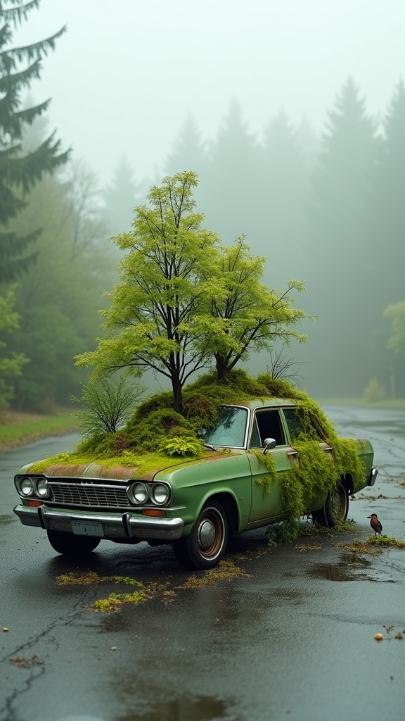 An abandoned vintage car in a grey empty parking lot, but a dense miniature bright-green forest has grown out of every opening — chartreuse trees growing through the sunroof and broken windows, lime moss covering the hood and roof like a canopy, tiny glowing mushrooms in the wheel wells, roots cracking the asphalt around the tires, a bird perched on the side mirror, morning fog, cinematic, 8k