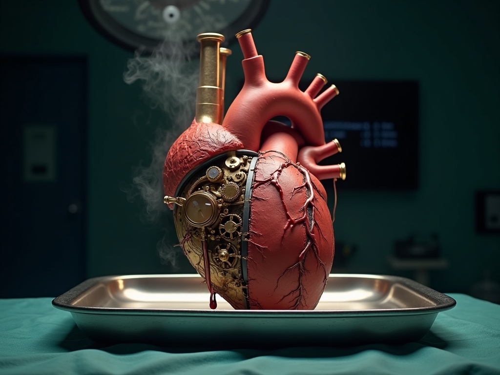 A hyper detailed anatomical human heart sitting on a sterile surgical steel tray, but the organ is half biological and half mechanical, the left side raw red muscle tissue with visible veins and arteries, the right side polished brass gears copper pipes and tiny pressure gauges, the transition line between flesh and machine jagged and organic, both sides actively working with blood dripping from the organic half and tiny puffs of steam from the mechanical half, harsh overhead surgical lamp, dark operating room background, medical photography, 8k
