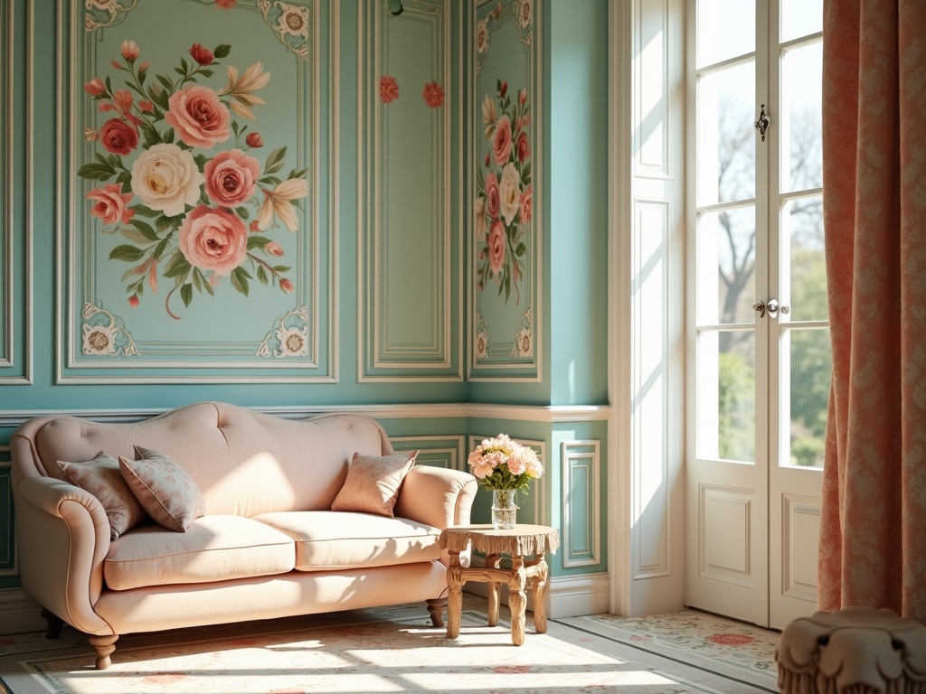 A cropped glimpse of an elegant interior filled with turquoise, coral, and cream floral patterns, painterly decorative detail, soft daylight, luxury design moodboard aesthetic