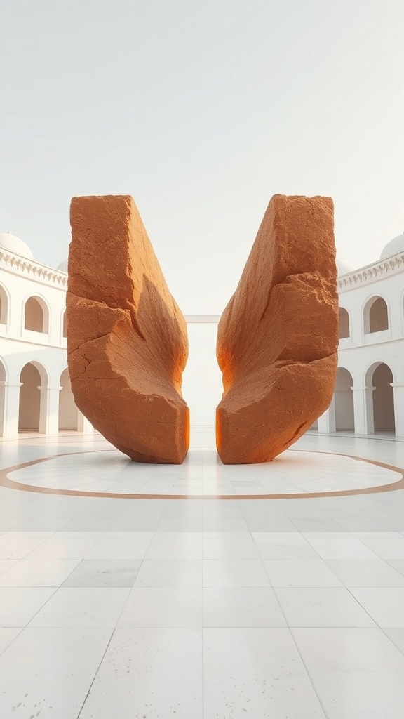 A massive warm-brown clay block split open in the center of a white plaza, inner glow, clean geometry, high-end surreal sculpture