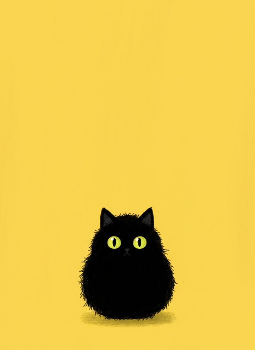 A fluffy round black cat sitting and staring directly at the viewer with enormous bright yellow-green eyes, minimal illustration style against a solid bright yellow background with faint vertical pencil line texture, the cat rendered with scribbly fuzzy black brush strokes suggesting messy fur, the body a simple pear shape, tiny ears poking up, the expression wide-eyed curious and slightly startled, the style charming naive and playful, the composition very simple with the cat small and centered in the lower third, plenty of negative yellow space above, digital illustration, 8k
