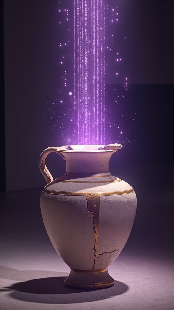 An ancient amphora with chipped white stone and gold seams, spilling not water but violet data ribbons and a soft lilac glow, subtle amethyst interference patterns hovering above the mouth, museum spotlight, surreal artifact photography