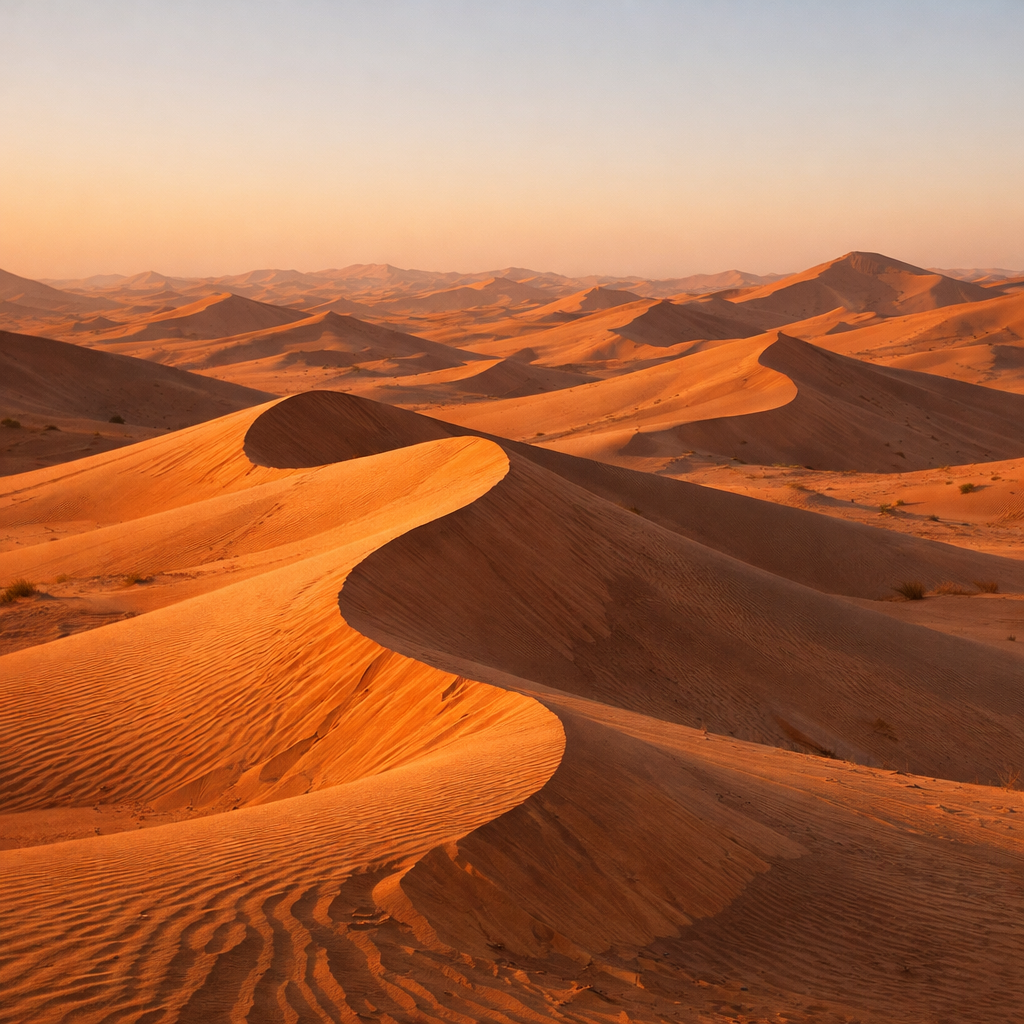 Desert landscape at golden hour, warm brown sand dunes, soft orange highlights, clear sky, cinematic photography style, ultra realistic
