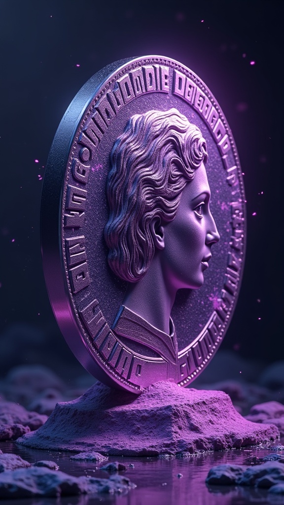 A giant ancient coin standing upright like a sacred object, the engraved profile flickering into lilac holographic layers and violet glitch shards, plum darkness around the edges, cool metallic highlights, sharp studio focus