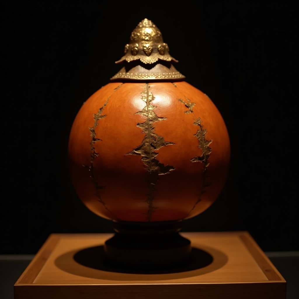 A samurai kabuto helmet displayed on a wooden stand, the entire helmet made from a large dried gourd shell in deep burnt orange, the natural cracks and breaks repaired with golden kintsugi seams creating a web of bright gold lines across the warm pumpkin orange surface, the ornamental crest sculpted from hammered copper in the shape of autumn leaves, dark museum background, Japanese artifact photography, warm focused light, 8k