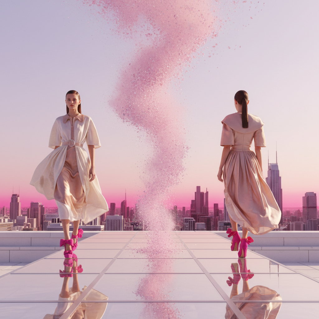 A rooftop fashion show where pale pink powder rain falls upward from the catwalk, pastel light pink air, cheeky pink heels, hibiscus pink horizon, editorial modern surrealism