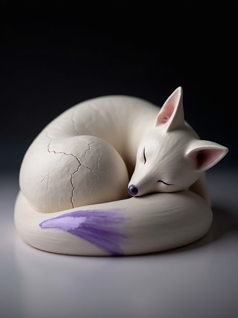 A curled sleeping fox made of polished ceramic, subtle fractures along the spine releasing a low violet glow, a whisper of lilac mist at the paws, matte ivory surface, dark shadowed background, tactile realism
