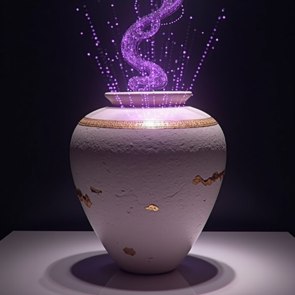 An ancient amphora with chipped white stone and gold seams, spilling not water but violet data ribbons and a soft lilac glow, subtle amethyst interference patterns hovering above the mouth, museum spotlight, surreal artifact photography