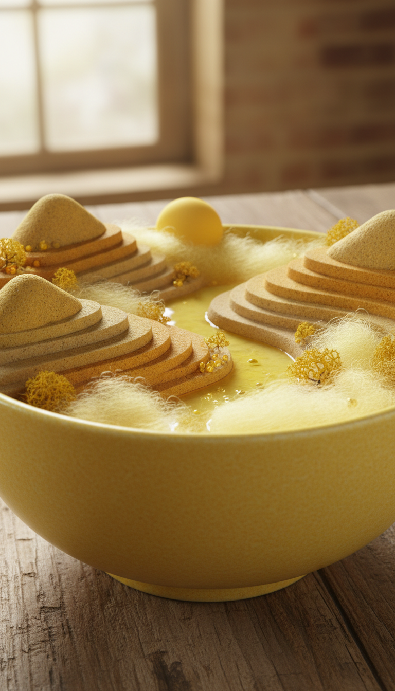 A yellow porcelain bowl holding a complete miniature sunrise landscape, layered natural-yellow hills, pale yellow fog, and a small river crossing the scene, tactile ceramic surface, grounded tabletop context, highly detailed
