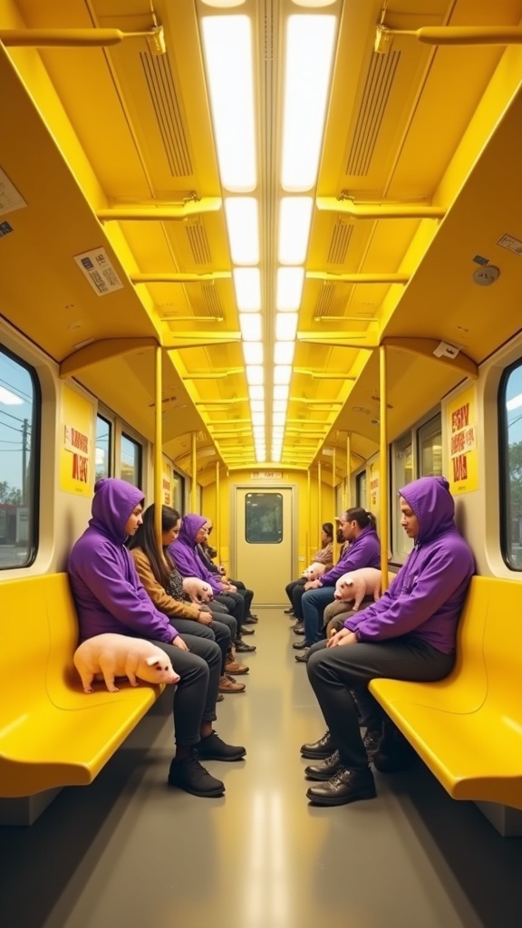 A commuter train interior where the overhead luggage racks have expanded into layered canary-yellow shelves stretching the full length of the carriage like floating architecture, bright vivid yellow seats, passengers in purple clothing sitting alongside small cute piglets on the seats, immersive everyday surrealism, ultra-detailed