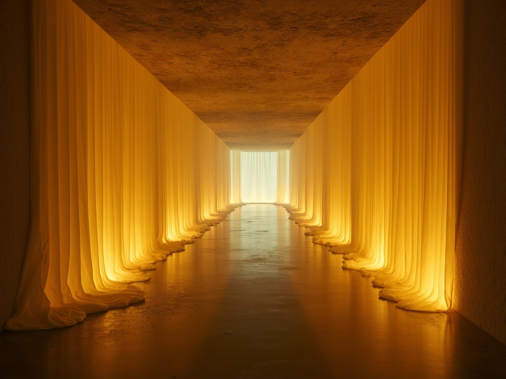 A long underground passage lined with ribbons of pale yellow light frozen into fabric-like curtains, the glowing material hanging from the ceiling in heavy folds, quiet atmosphere, realistic reflections, cinematic composition