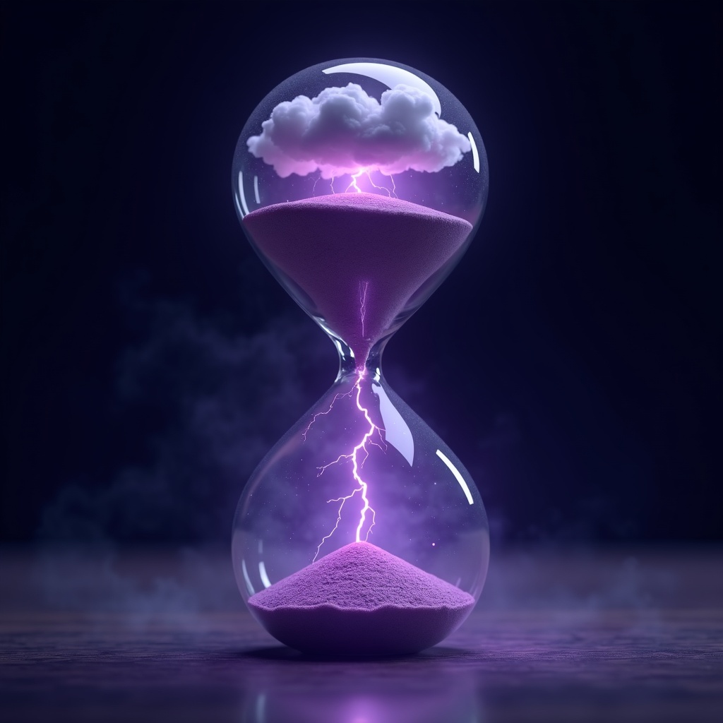 A crystal hourglass holding a living thunderstorm instead of sand, miniature storm clouds spiraling between the chambers, thin violet lightning, lilac mist, silver reflections, deep plum shadows, cinematic dark background, magical realism, hyper-realistic glass textures, sharp focus, premium product photography, 8k