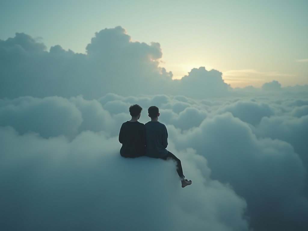 Two young people sitting together on the edge of a large soft cloud high above a dramatic cloudscape, their legs dangling over the side, looking out at the vast moody blue grey sky, wearing simple dark clothes, the clouds volumetric and painterly, the light soft and overcast with golden warmth at the horizon, peaceful and contemplative, cinematic, 8k