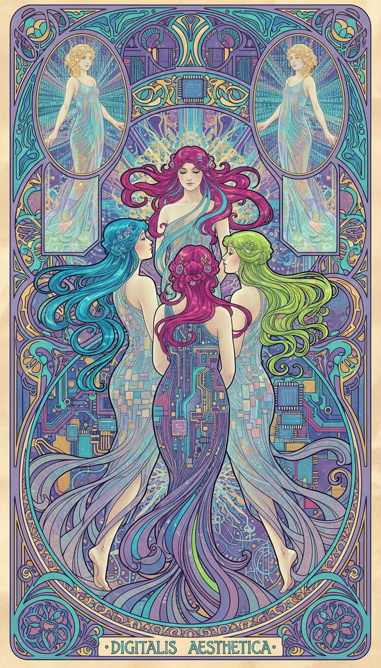 Cyberspace in the style of Alphonse Mucha, digital nymphs with neon hair framed by ornaments made of microchips, holographic posters with elegant female figures surrounded by patterns of binary code, color palette of lilac turquoise gold and pearl, vertical composition with decorative frames and elegant flowing lines, a feeling of digital beauty in art nouveau style, 8k