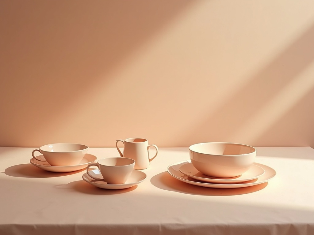 A dining table slowly dissolving into low floating apricot porcelain fragments, pale peach tableware still perfectly aligned, luxury interior, impossible stillness