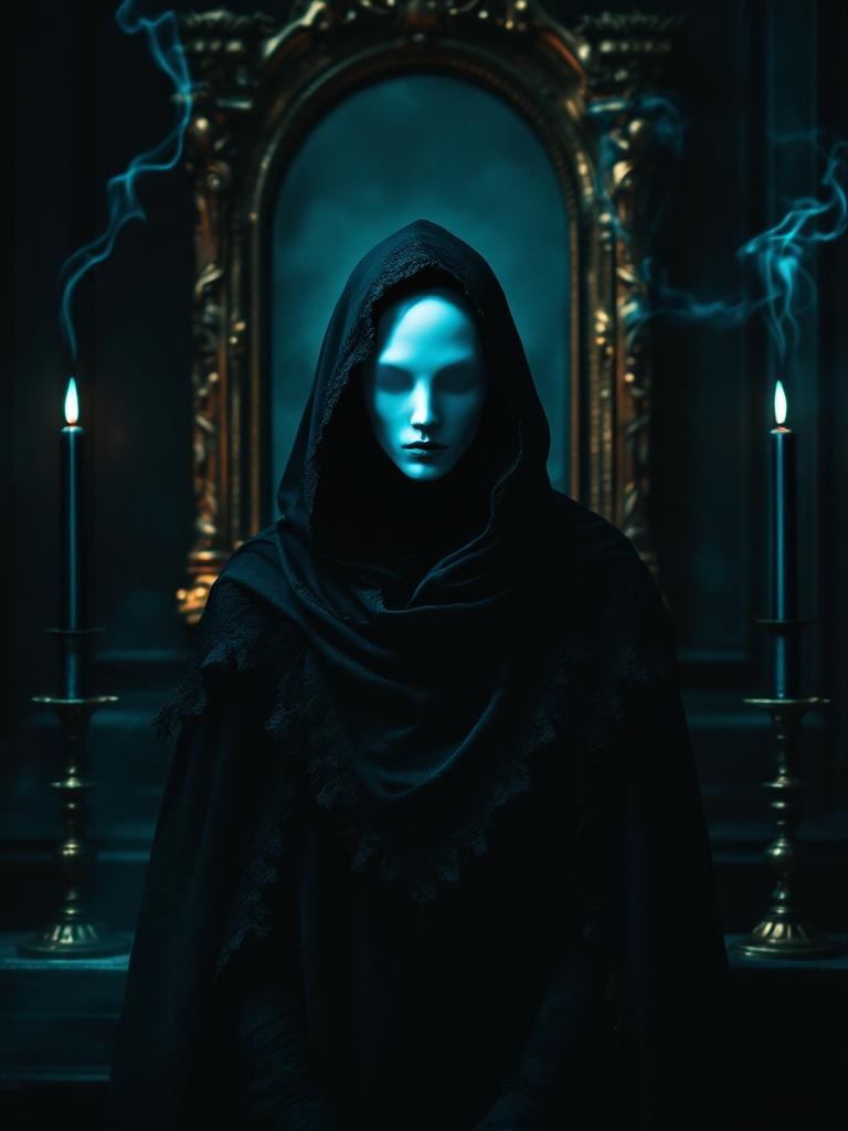 A mysterious hooded figure standing in a dark Gothic chamber, wearing a smooth white porcelain mask with no expression, draped in layers of black lace and velvet cloak, an ornate gilded mirror behind reflecting a different version of the figure one with no mask showing hollow darkness beneath the hood, tall black candles flickering on either side casting deep teal and cold blue light, wisps of smoke curling around the figure, the atmosphere heavy and still, dark cinematic photography, shallow depth of field, 8k