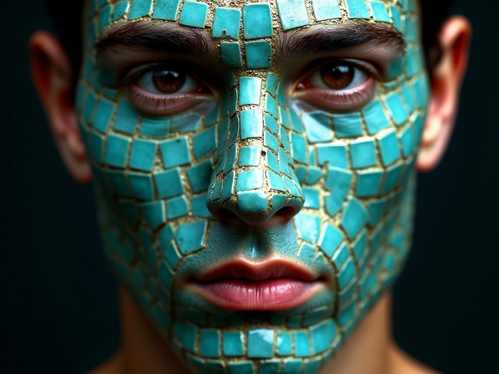 Extreme close-up portrait of a mans face where the skin has transformed into a mosaic of tiny turquoise and teal ceramic tiles — each small square tile perfectly fitted and following the facial contours over nose bridge and cheekbones, hairline cracks in some tiles revealing warm skin underneath at the jawline, thin gold grout lines between all tiles, the eyes completely natural dark brown and human looking out from within the tiled surface, eyebrow hairs growing through tile gaps, dark studio background, editorial portrait photography, 8k