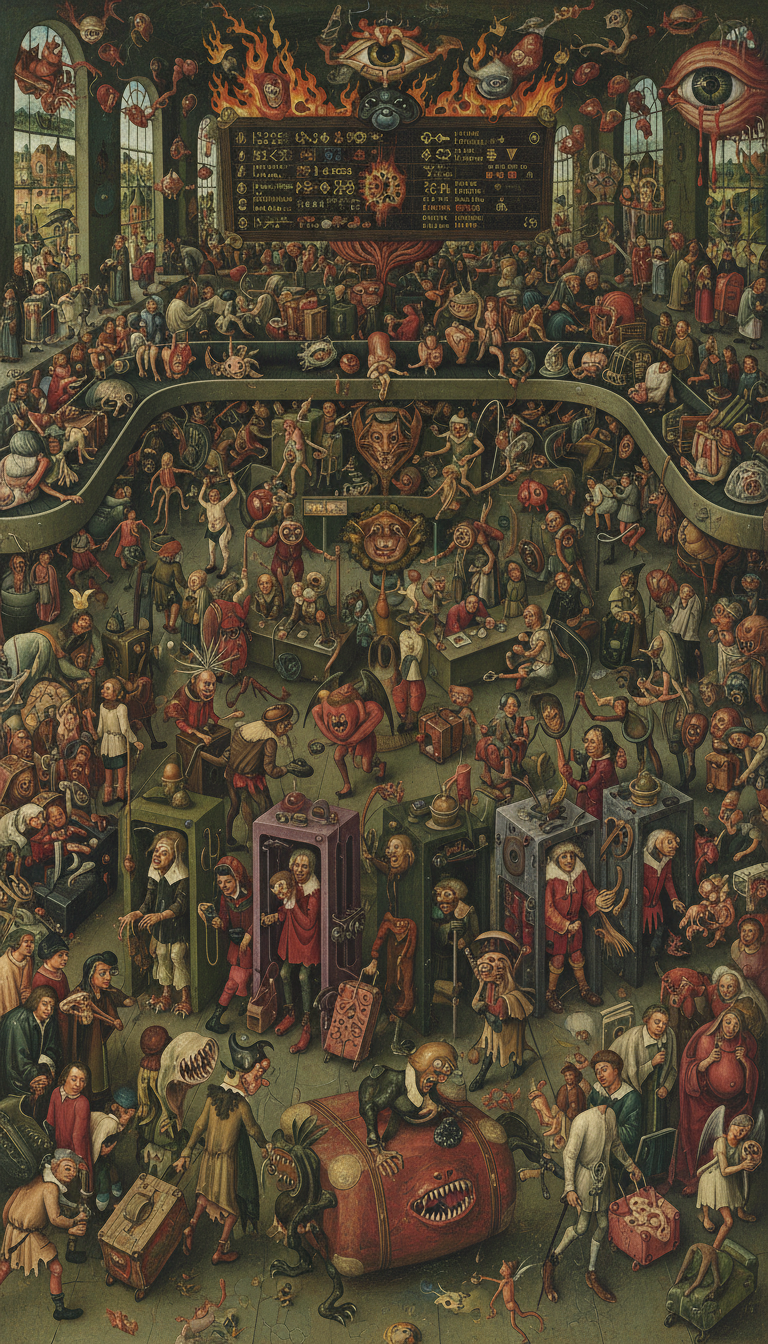 An international airport terminal in the style of Hieronymus Bosch, passengers dragging monster shaped suitcases, security scanners resembling medieval torture devices, departure boards displaying demonic symbols instead of flight numbers, fantastical creatures working as staff, baggage carousels carrying surreal grotesque cargo, color palette of dark green burgundy and orange with acid bright accents, densely populated multi figure composition, an allegory of modern travel, highly detailed grotesque, 8k