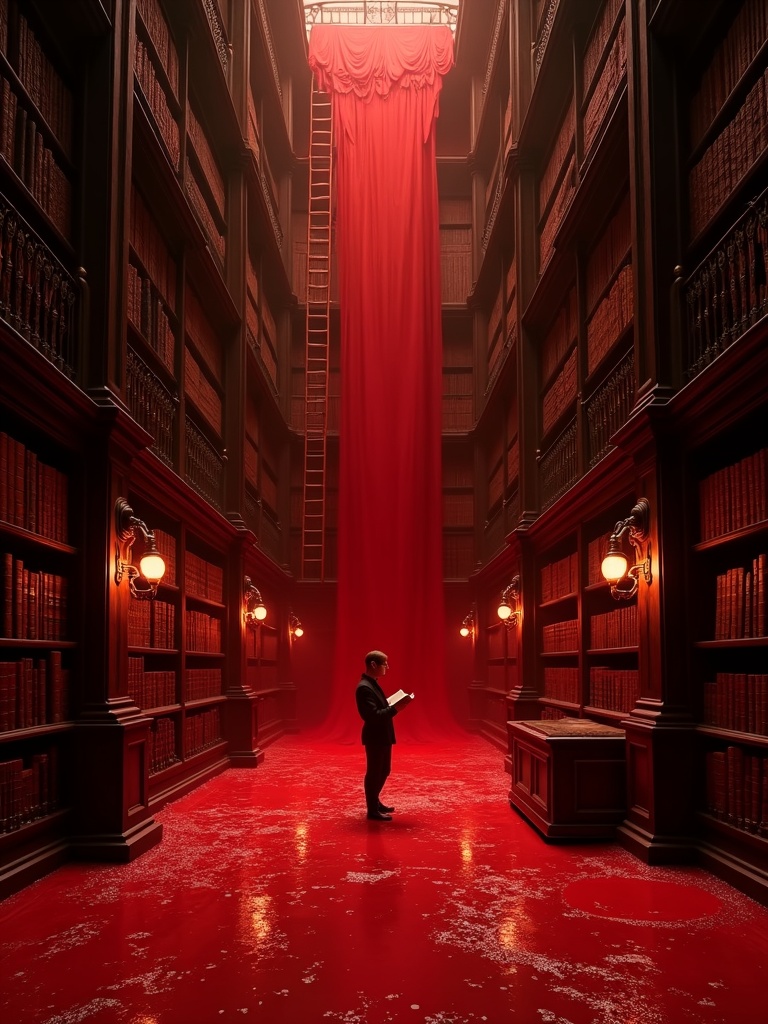 A grand old library with towering wooden bookshelves where thick vivid red ink is pouring out of open books on every shelf, rivers of bright crimson ink cascading down the shelves like waterfalls, pooling on the marble floor in deep scarlet puddles, a person standing ankle-deep in red ink reading a book calmly, red ink dripping from the ceiling, antique brass ladders and reading lamps partially submerged, the red ink glows faintly in the dim library light, dramatic contrast between dark wood and vivid red, highly detailed, sharp focus