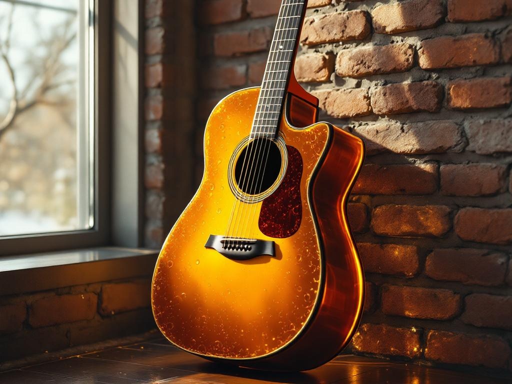 An acoustic guitar leaning against a brick wall, made entirely of hardened amber caramel — the translucent burnt-orange body showing trapped air bubbles and dark sugar swirls, the neck a gradient from golden to deep toffee brown, strings stretched from thin caramel threads, one corner softening and beginning to droop from the warmth of nearby sunlight through a window, rich amber reflections, 8k