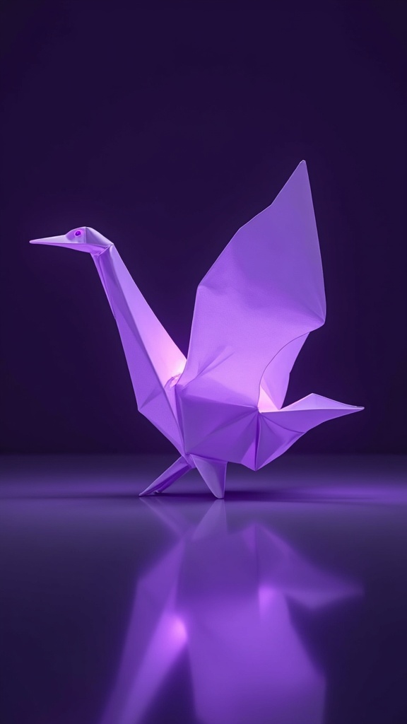 An origami crane formed from amethyst light with razor-clean folds, a faint lavender halo around the wings, plum darkness behind, cool silver reflections on the floor, minimal composition, high-end surreal design