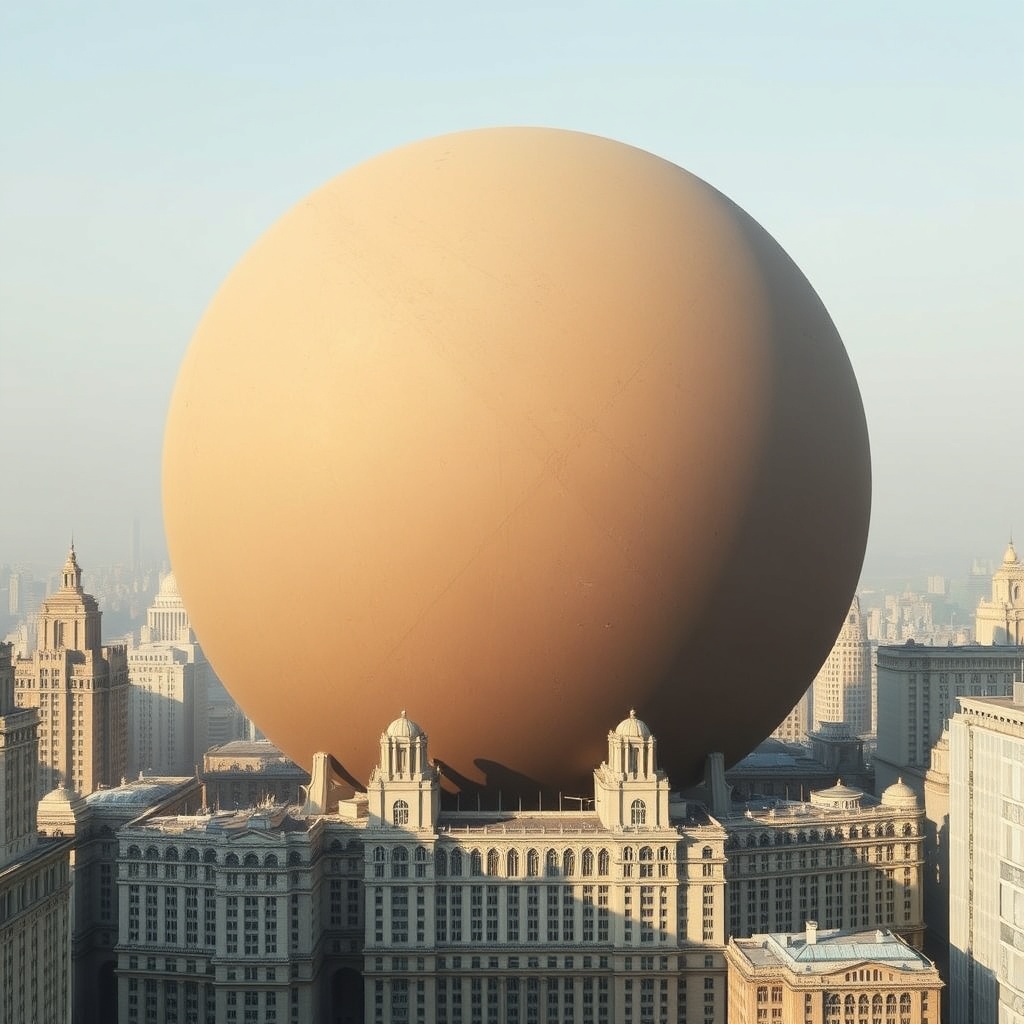 A giant matte brown sphere resting in the center of a financial district, pale stone towers around it, minimal heroic composition