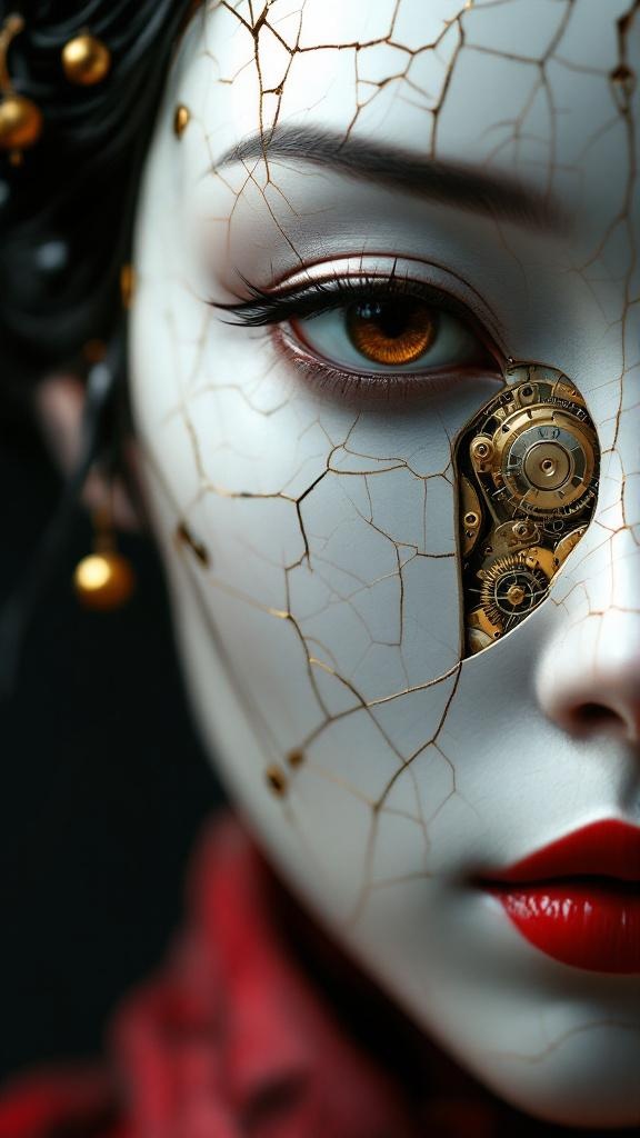 Extreme close up portrait of a feminine android geisha, her face made of cracked white porcelain with thin golden kintsugi repair lines running through the fractures, exposed brass clockwork mechanisms visible at the temple and jaw joint, traditional red lip pigment painted precisely on the ceramic mouth, one eye human and dark brown the other a mechanical iris of spinning amber rings, black lacquered hair ornaments with tiny golden bells, deep burgundy silk kimono collar visible at the bottom edge, dark background, fashion editorial, 8k