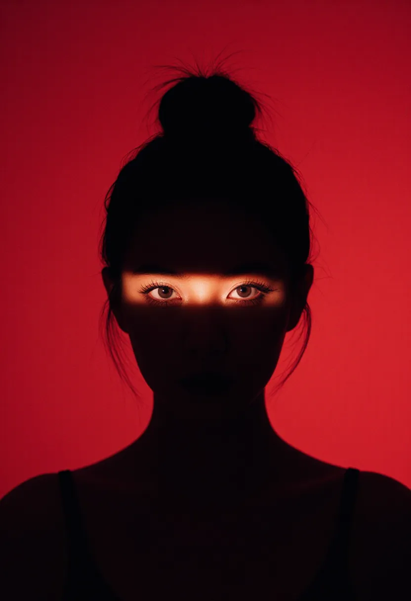 Create an image of a woman, rendered in dramatic chiaroscuro against a vibrant red backdrop. The woman is primarily silhouetted in deep black, with only her eyes and the area immediately surrounding them illuminated by a thin band of warm, reddish light. Her hair is styled in a neat bun on top of her head. The lighting should create an atmosphere of mystery and intensity, emphasizing the gaze of the woman. The overall style should evoke a sense of modern artistry.