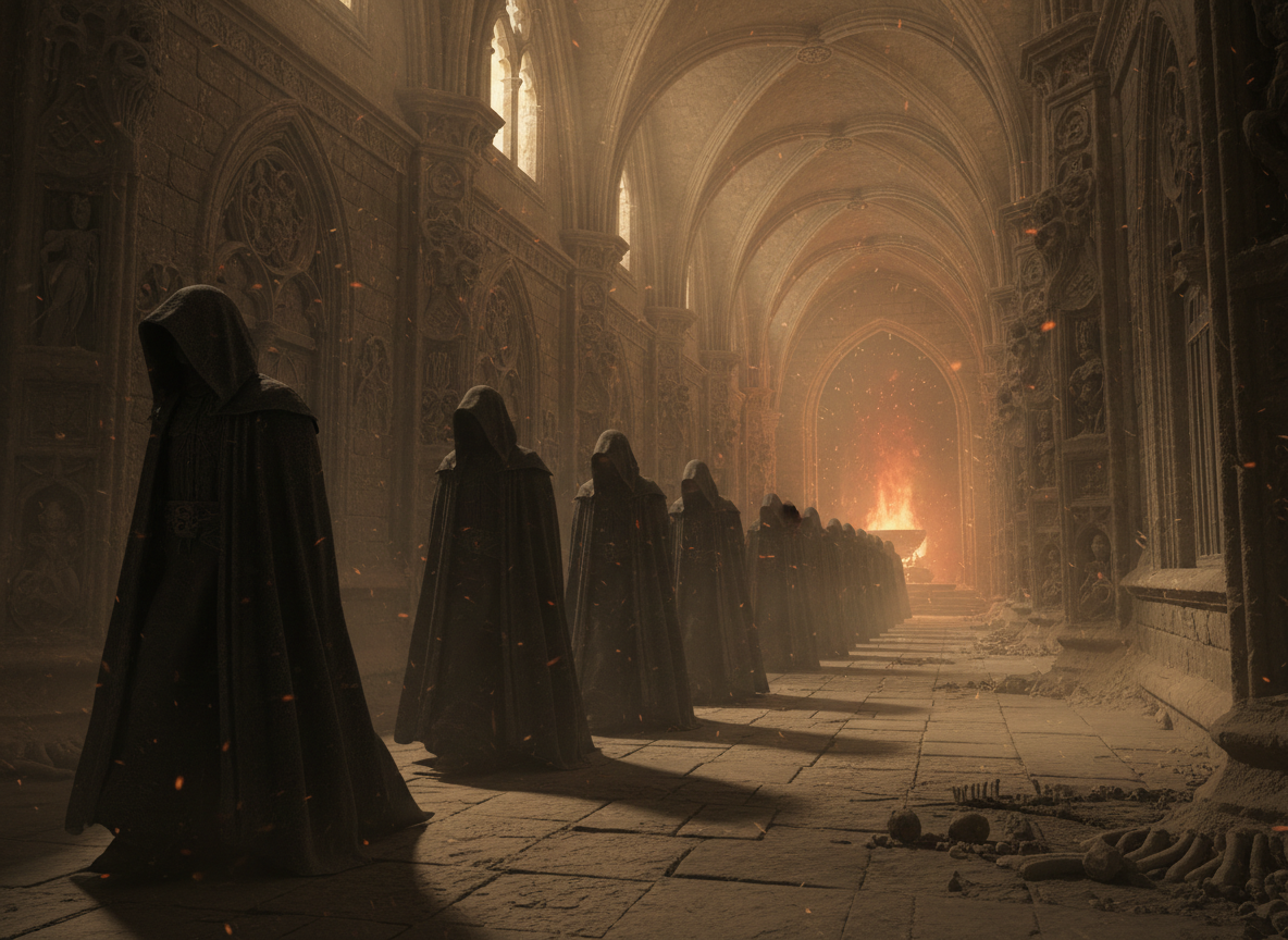 A procession of black-robed figures moving through a sepia-lit gothic corridor toward a distant furnace glow, dust and ash in the air, mystical underworld realism