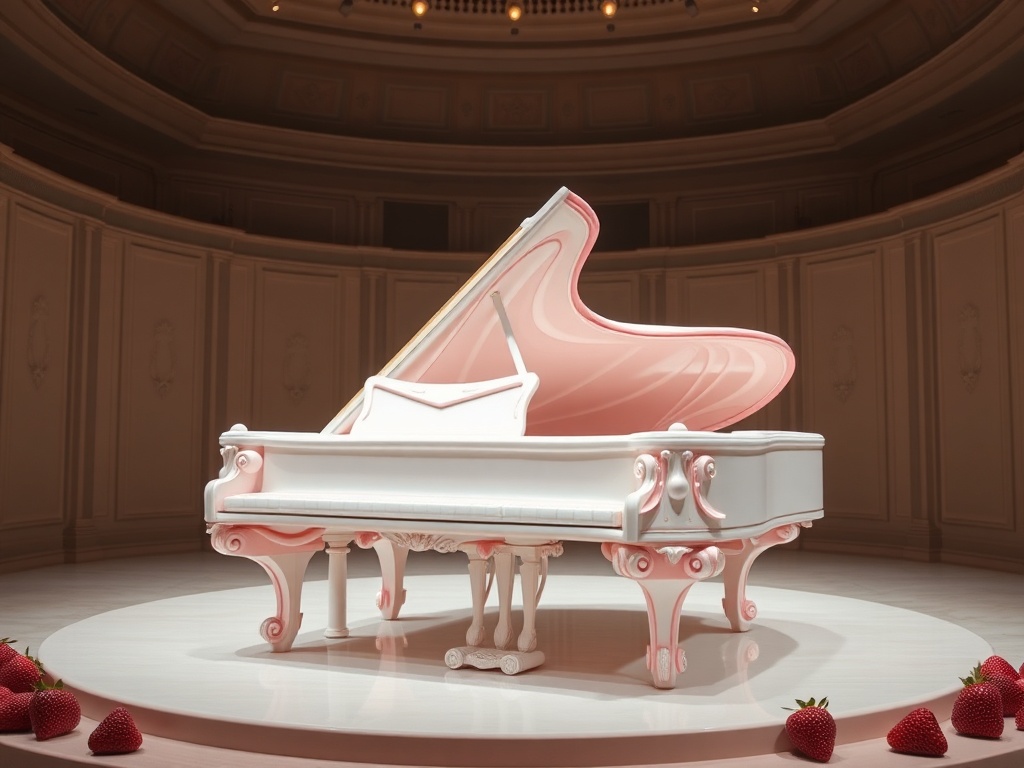 A grand piano carved from pale strawberry meringue with glossy raspberry edges, empty concert hall, elegant impossible luxury