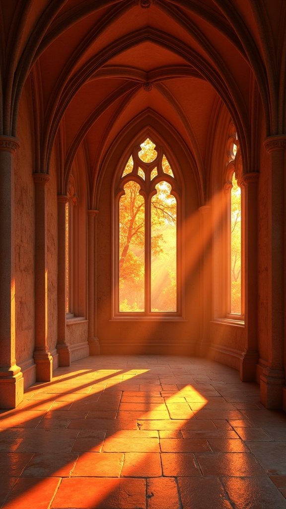 A chapel of mirrors in full Gothic style, but each pointed window reflects a different orange season, apricot spring fog, mandarin harvest light, burnt orange dust, pale peach dawn, stone tracery, devotional mood, photorealistic, 8k