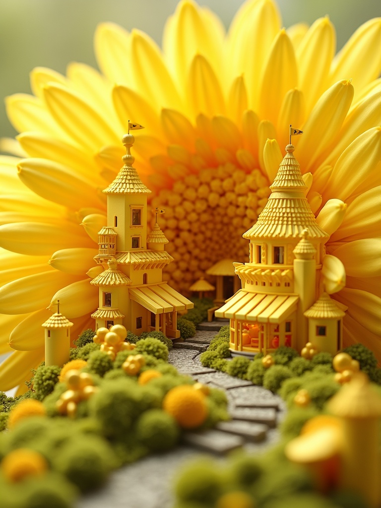 A detailed miniature city built entirely inside a giant yellow chrysanthemum, tiny streets and stairways woven between pale yellow petals, canary-yellow market awnings, fresh green stems below, magical scale contrast, macro realism, ultra-detailed