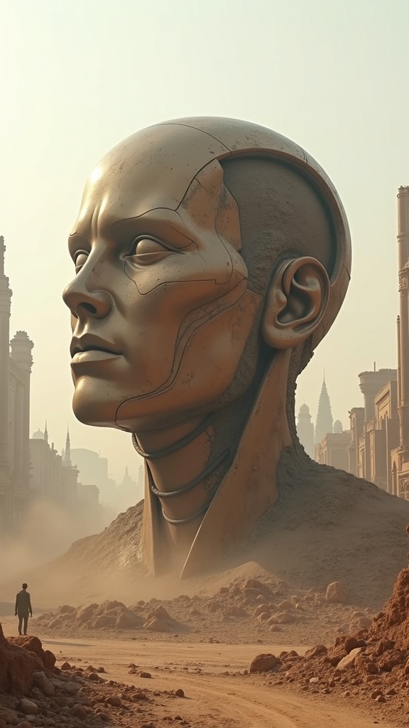 A gigantic bronze-brown android head half-excavated in a city plaza, soft dust drifting around the ruins, pale morning sky, future archaeology, monumental hero image