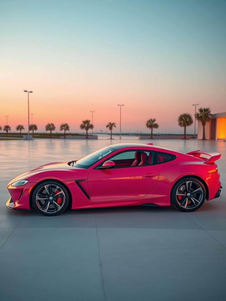 A sleek sports coupe with bodywork like frozen strawberry sorbet and pale candy-glass windows, parked on a white plaza at dawn, premium surreal design