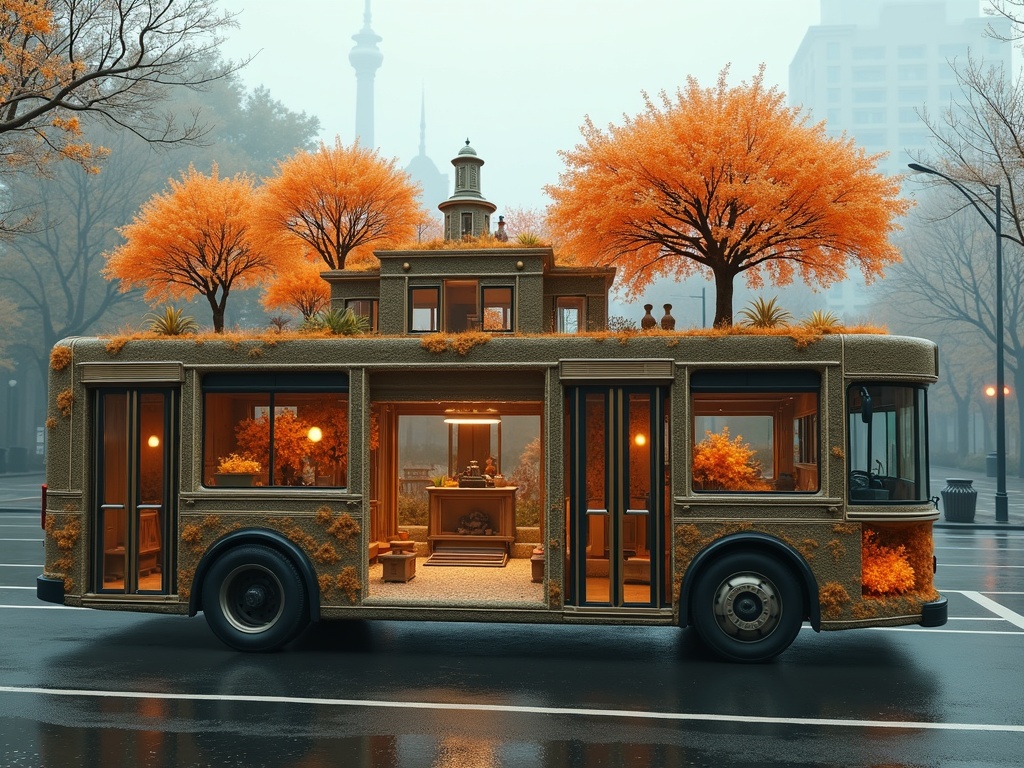 A city bus shown in impossible cross section while still driving through traffic, its upper deck revealing a complete burnt orange monastery garden with cloisters, apricot gravel paths, and silent orange trees inside the vehicle shell, rainy boulevard outside, photorealistic surrealism, 8k