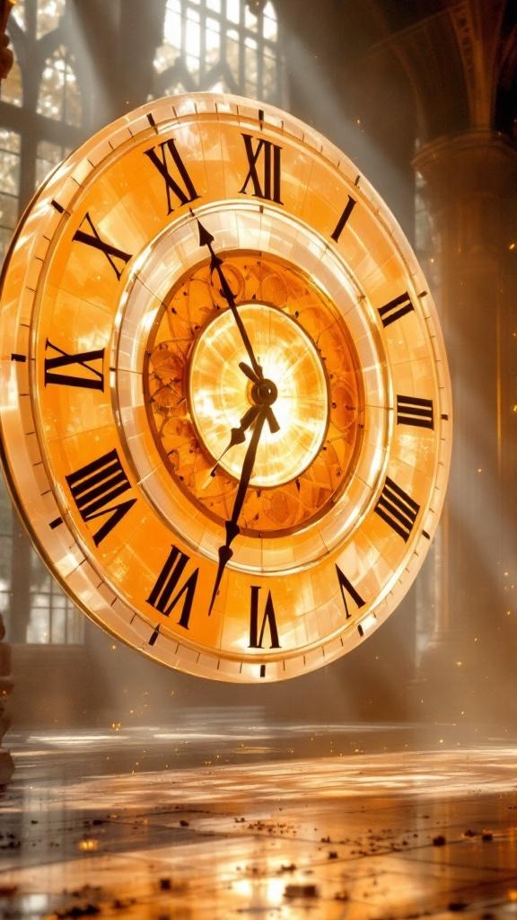 A monumental train-station clock made of translucent apricot glass, its inner gears replaced by concentric rings of sunrise, soft tangerine light through dust, photorealistic interior scene