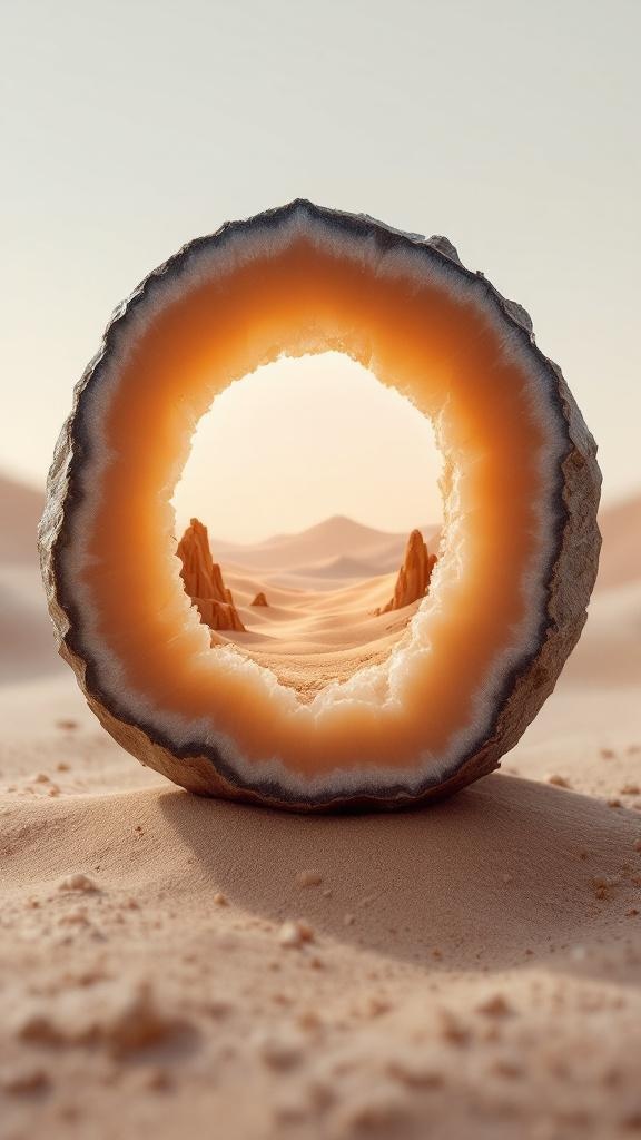 A rough geode ring holding a complete miniature apricot desert eclipse inside the stone opening, pale dunes, soft peach sky, tiny rock spires, macro realism, highly detailed
