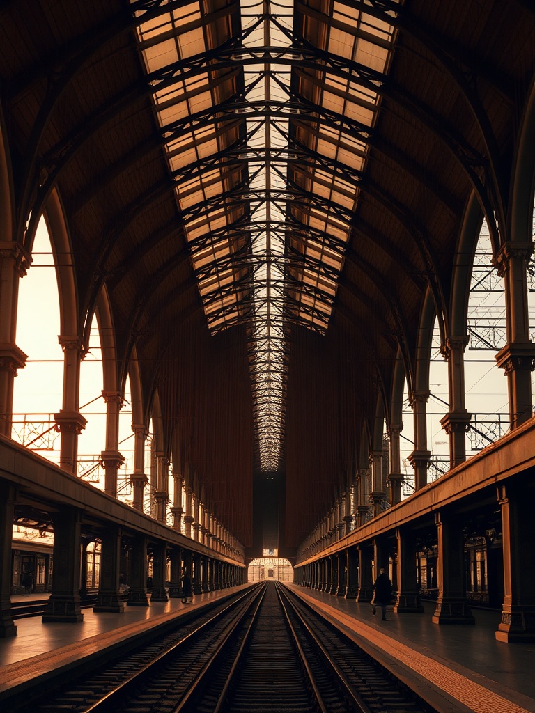A monumental train station bathed in brown dusk, deep chocolate curtains hanging between the arches, cinematic travel fantasy