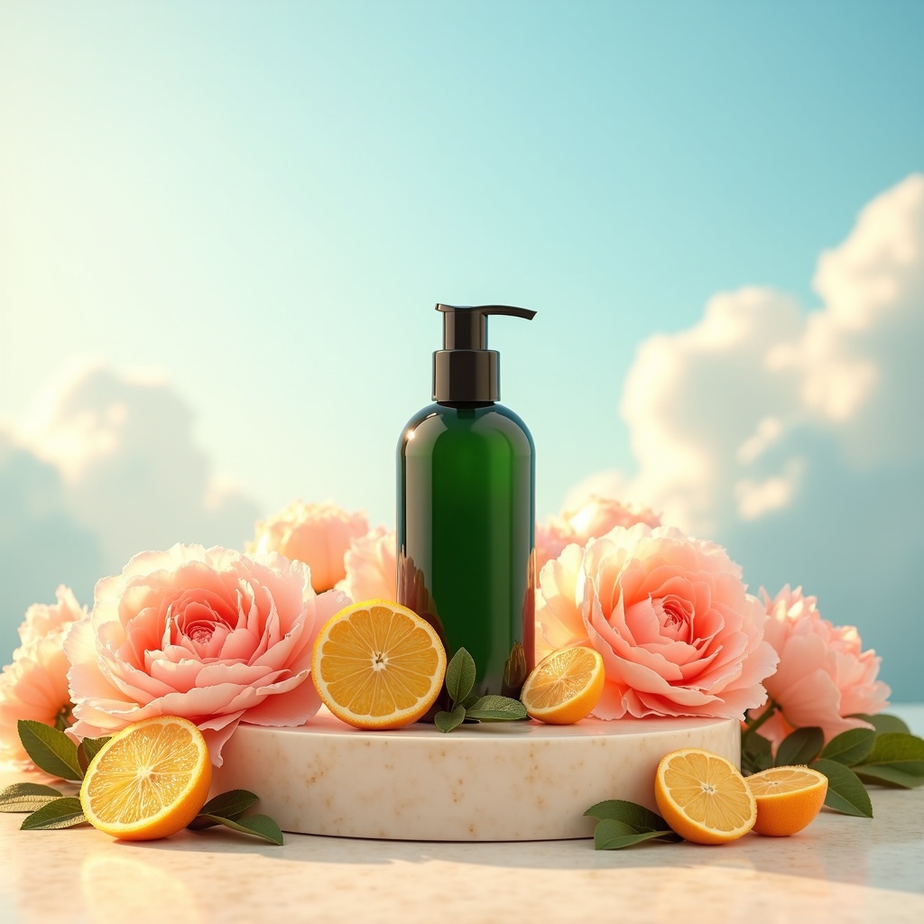 A dark green glass bottle of botanical skincare product centered on a round cream stone pedestal, surrounded by an explosion of fresh pink and peach garden roses and peonies, sliced lemons and whole oranges scattered at the base, the background a vivid clear blue sky with soft white clouds, the flowers appearing to grow upward around the product naturally, warm golden sunlight from the left creating gentle highlights on the glass bottle, water droplets on the citrus slices, a few green leaves adding freshness, commercial product photography, bright optimistic mood, 8k