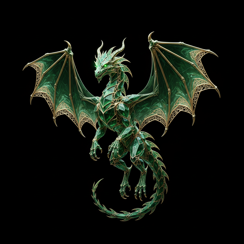 A translucent bat-winged dragon formed from emerald glass and pale gold filaments, floating against a black void, intricate fantasy design, luminous edges, luxury creature study