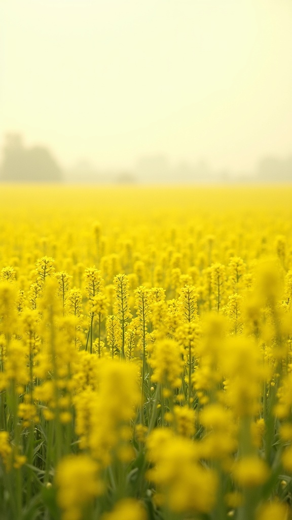A vast rapeseed field stretching to the horizon, dominated by pale yellow and natural yellow blossoms, dense layers of flowers filling most of the frame, fresh green stems below, soft morning haze, clean daylight, immersive natural environment, realistic textures, richly detailed