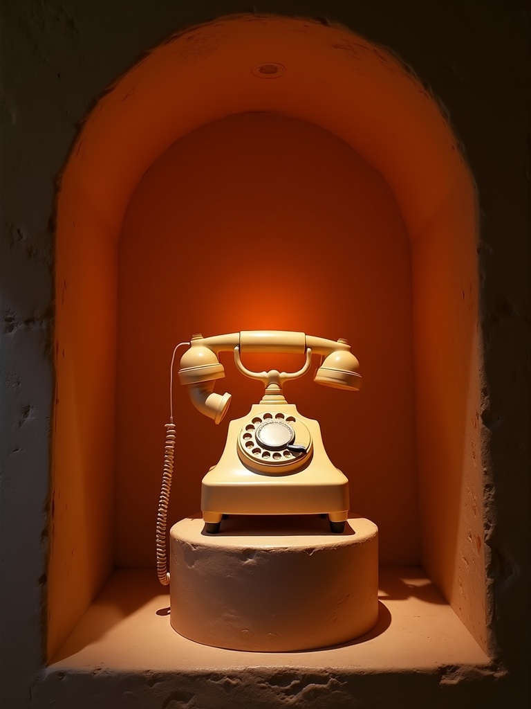 An old rotary telephone displayed like a sacred relic inside a dim stone apse, its shell carved from light apricot ceramic with soft peach-orange patina, natural orange glow rising from the dial, saturated mandarin votive reflections flickering across the pedestal, deep burnt orange shadow inside the alcove, ordinary object transformed into ritual treasure, museum realism, richly detailed